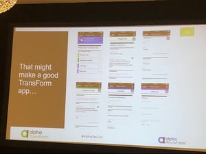 Robin Bennett of Start Software told a fascinating story about how the AllTold® app project is designed to help senior citizens combat social isolation and loneliness and strengthening their memories. Research shows that storytelling can be used to enhance social, physical, and mental well being in seniors. The app, developed by Robin Bennett and a former British counterterrorism expert, enables senior citizens to record and share their life story on a mobile device -- essentially a digital scrapbook of memories and photos -- for family and friends. As part of the presentation, Bennett demonstrated how easily and quickly the app can capture life events, add images and tag memories, then share the data in many ways or even as a PDF document. Why build it in Alpha Software? We were confident it would scale reliable and easily, and we knew Alpha would provide a solid framework without ANY restrictions. He explained that Humana Healthcare is currently conducting a pilot of the app, and the company currently has more leads than they can handle, including law enforcement agencies looking to record incidents. Bennett also discussed some of the ways he imaged utilizing Alpha TransForm in the future.